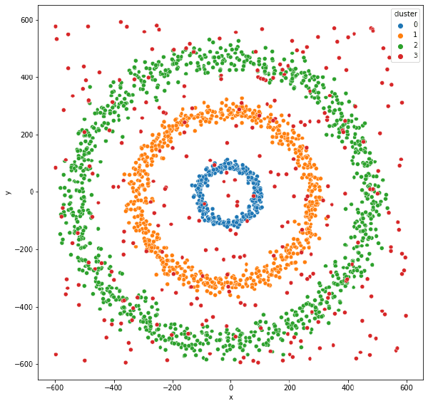 data['dbscan'] = DBSCAN(eps=32, min_samples=5).fit_predict(data[['x', 'y']])