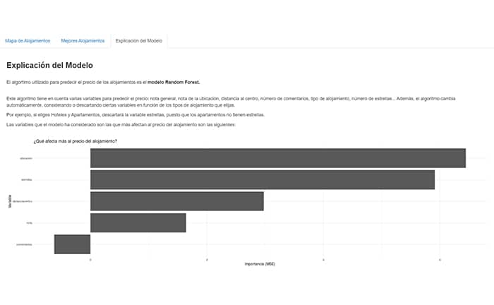 - Permite conocer la importancia de las variables en cuanto a la explicación del modelo, de modo que no solo sabemos el precio del alojamiento, sino que también sabemos qué es lo que más afecta en el mismo. Esto nos da una idea sobre el modelo, lo cual modelos de caja negra no te pueden ofrecer.