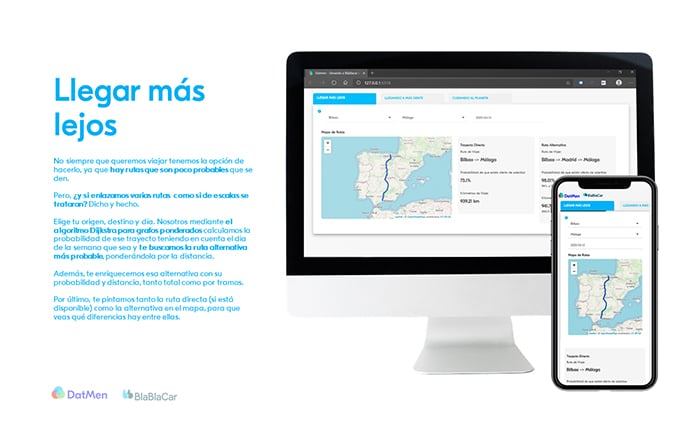 Así pues, nuestra solución fue crear un planificador de viajes de Blablacar que te diga la probabilidad a futuro de un trayecto para una fecha dada y, además, te busque una ruta alternativa corta y probable por si la ruta directa es raro que ocurra.